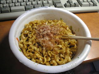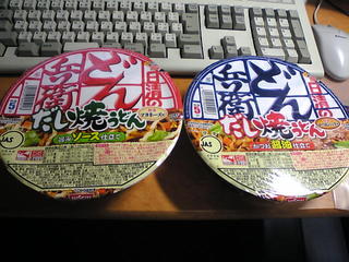 甘辛いソースと湯切った、どん兵衛麺は