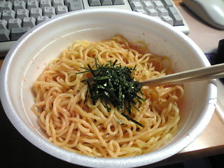 実際には、湯切りして、たらこ醤油バター入れて混ぜて